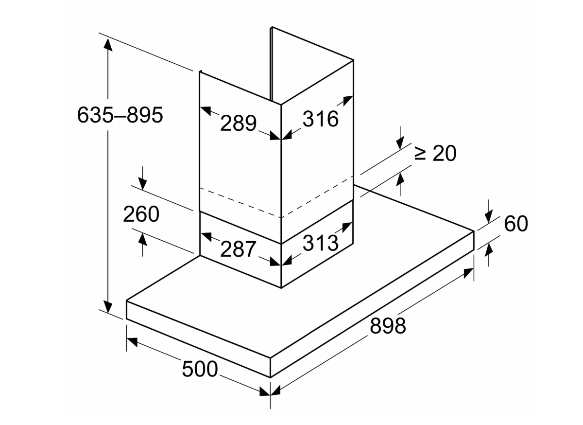 - Dimensions appareil en évacuation d'air (HxLxP): 635-895 x