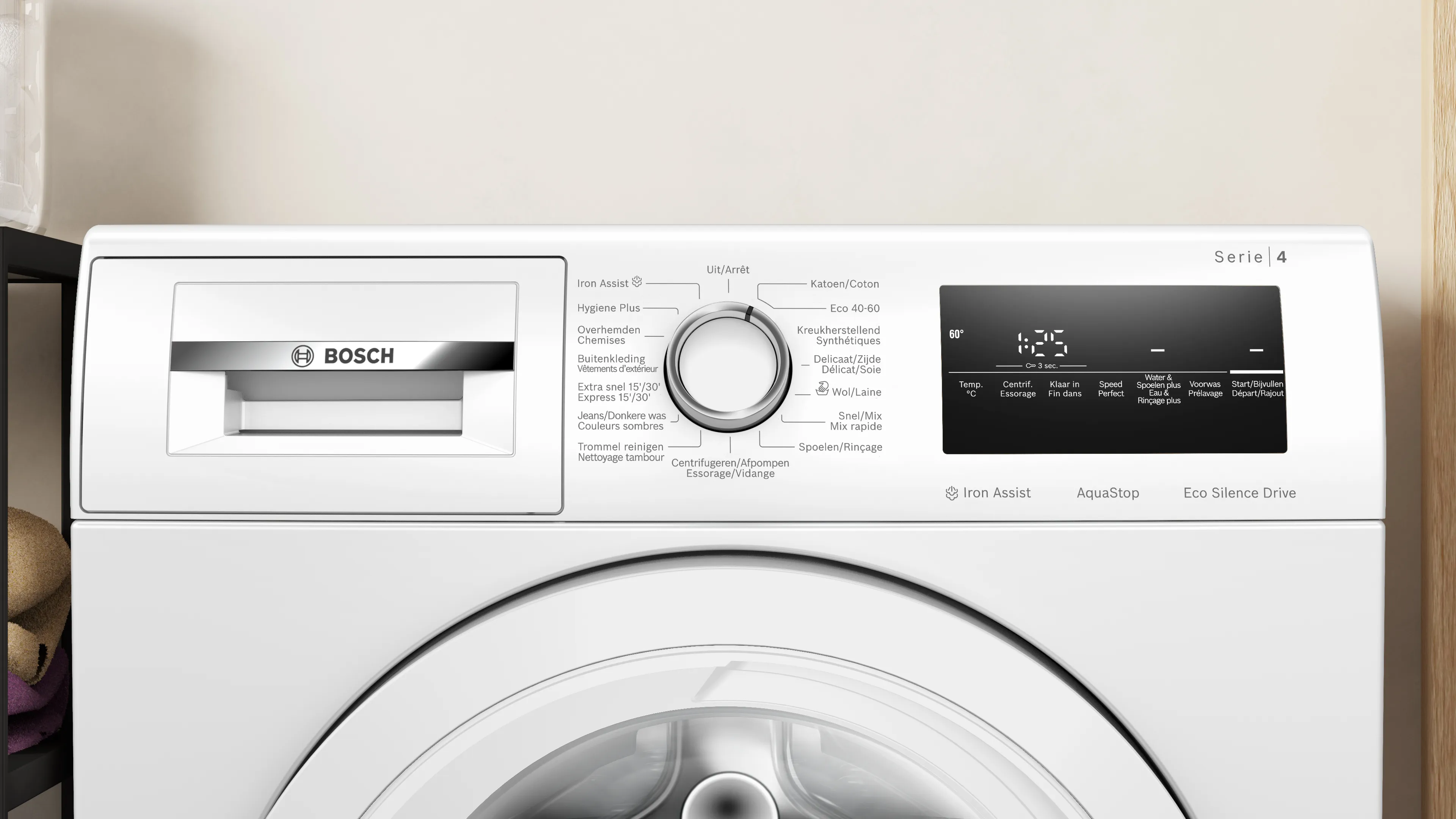 Optimisation du lavage Blouses/Chemises, Départ/Stop avec fonction rajout de linge, Express 15 min/30 min, Fin différée, Mix rapide, Outdoor, Prélavage, repassage facile à la vapeur, Rinçage unique, SpeedPerfect, Température, Vidange/Essorage, Vitesse d'essorage