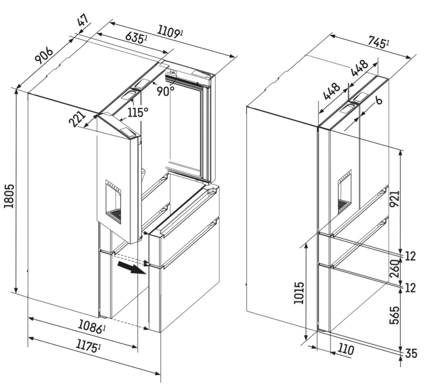 Poids max. de la porte du placard réfrigérateur - Poids net / Poids brut 132,6 kg / 146,2 kg